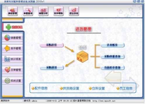 美萍汽配管理软件是一款专业的汽车配件管理系统,其中包含汽车配件进货管理、配件业务管理,配件库存管理,统计报表系统等子模块,是专门为汽车配件行业定制的配件进销存管理系统。软件界面设计简洁,美观,人性化的软件流程,使普通用户不需培训也能很快掌握软件操作使用方法。美萍汽配管理软件广泛适用于汽车配件业务企业,汽车维修企业,汽车4S店等和配件有关场合,是您企业进行信息化管理的强大工具。